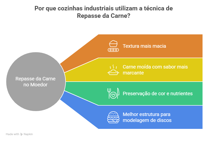 Um deles é o repasse de carne, uma prática muito comum em açougues, cozinhas industriais e indústrias alimentícias que buscam padronização, textura adequada e melhor qualidade na moagem.